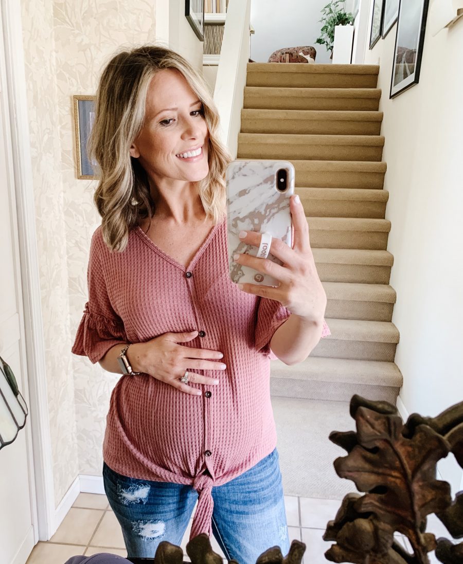 Ahh, by far my favorite part of this whole gig. I’ve been feeling him move around a lot lately, especially when I lie down at night. My Dr gave me a quick ultrasound at my last check up appointment, and we found out that my placenta is in the front, which means it’s acting like a cushion between my little guy and me. So, the kicks aren’t as obvious as they were in my previous pregnancies, but I can definitely still feel him in there.