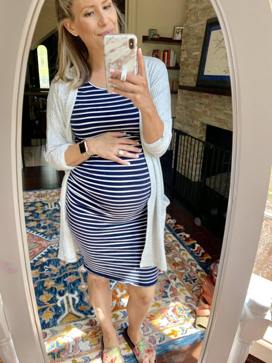 I picked upthis striped maternity dressfor our babymoon to Miraval last month, and it’s been on repeat ever since. It’s super flattering (I’m guessing that’s why there are SO many horizontal stripes in maternity clothes). It’s less than $25. I’m wearing medium.This cotton cardigan is $18 and I’ve worn it SO much already. I love that it’s lightweight enough for summer, and I have worn it over my dresses or over leggings and a tank. Love. I’m wearing medium, but would rather have a small. I’d say it runs a little big.