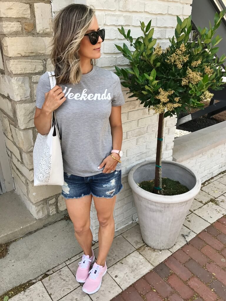 I love the outfit. I love wearing simple comfortable things on the weekend but sometimes I dress up. There’s no in between with me. I love the quote tee and love the pop of pink shoes.