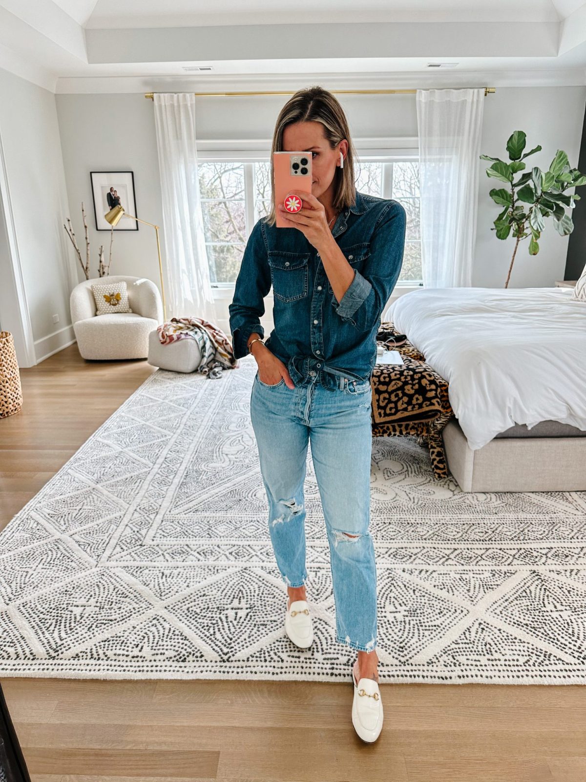 This is probably my most worn pair of jeans. I have two pairs – the distressed pair I’m wearing here, and a pair with no distressing. They have a lot of stretch and are great for #momlife. If you’re in between sizes, I would size up. Bonus, they’re on sale!