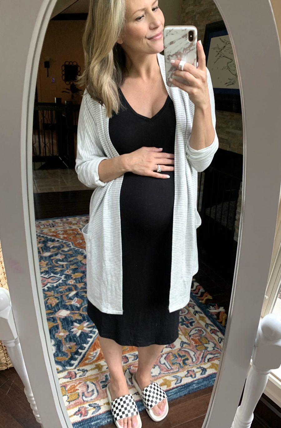 This maternity midi pencil skirt is SO good, you guys. If you work out of the home, pair it with an easy cotton blazer and booties and you’re good to go. I’ve been wearing it a lot – to the park with my kiddos or to run errands. It’s a perfect leggings alternative.