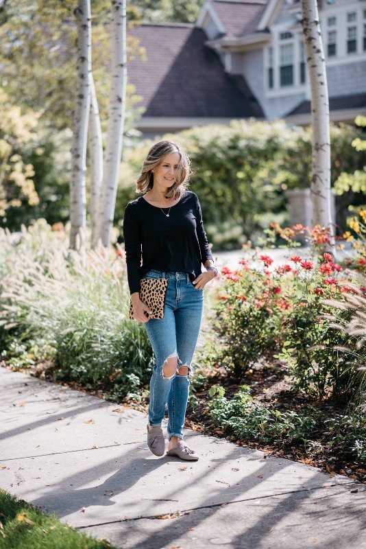 I have these jeans as well and they are on repeat in my closet, they’re so comfy and versatile! I love the way you paired them with the mules and leopard clutch, super cute!