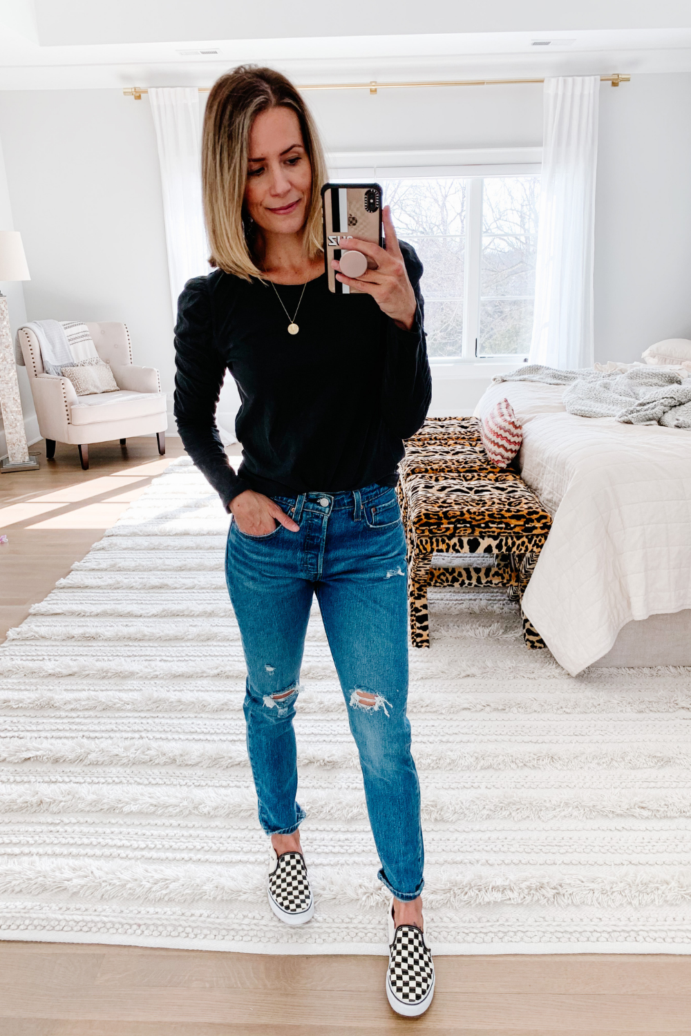 This ruched sleeve tee is a fun twist on a classic. I have it in the ivory and black and they’ll be on repeat all spring. I’m wearing small.