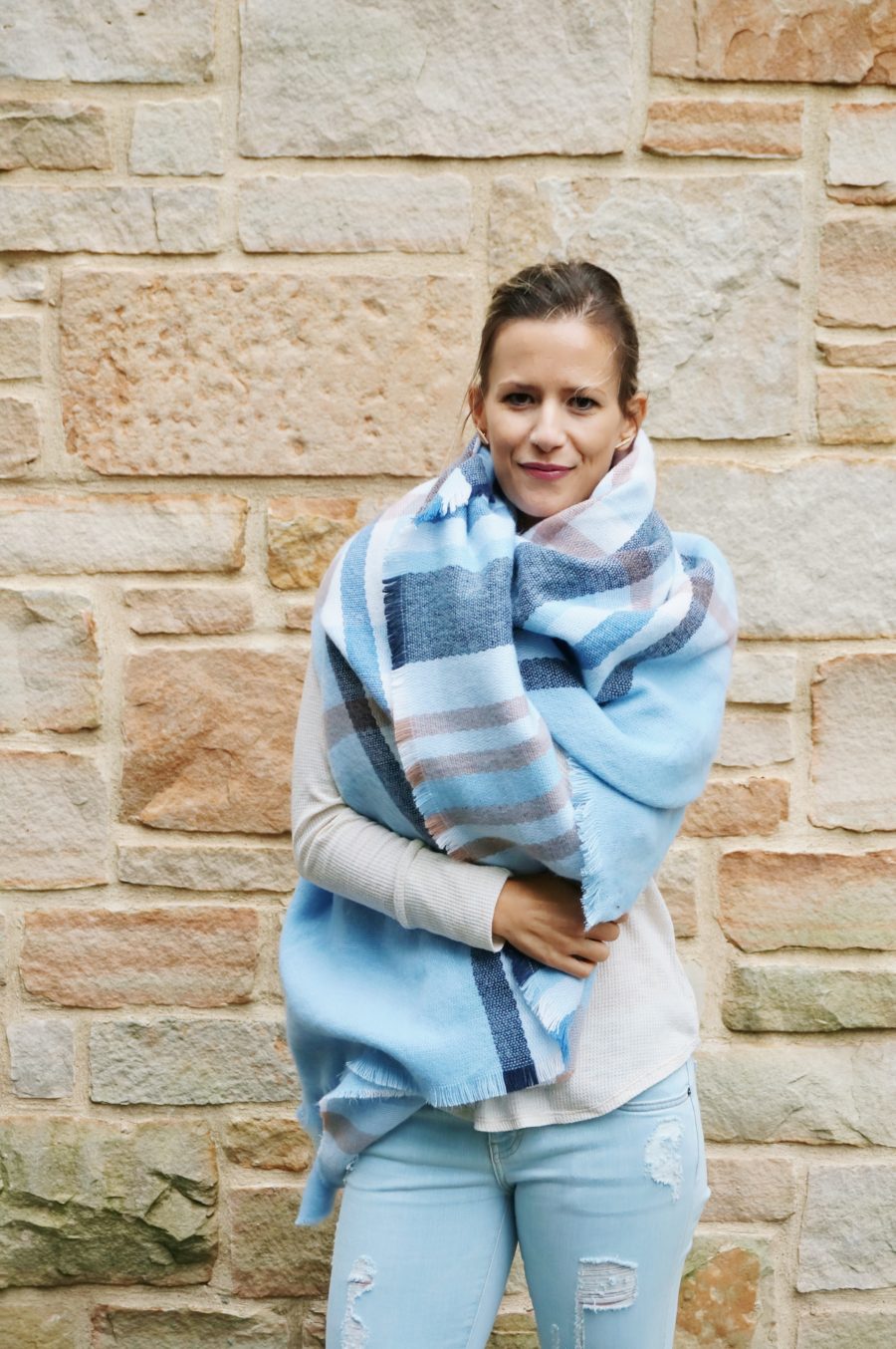 Ahh, the blanket scarf!! I feel like the blanket scarf has become a fall staple for everyone these days. I love the blue color! Too cute.